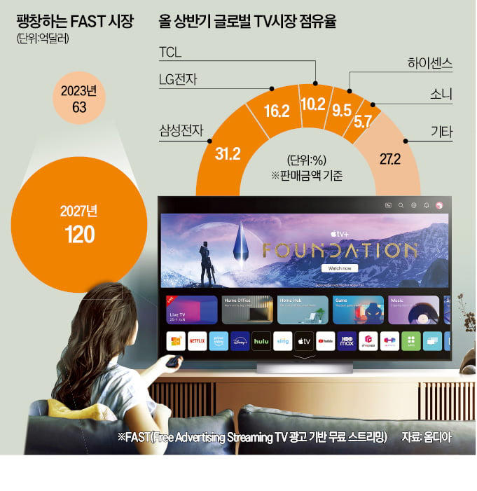 LG전자가 57년 동안 이어온 기존 TV 사업 전략을 확 바꾼다. TV 판매 점유율에만 몰두하지 않기로 전략을 선회했다. 대신 17조원 규모에 이르는 ‘광고 기반 무료 스트리밍’(FAST) 시장 개척에 집중
