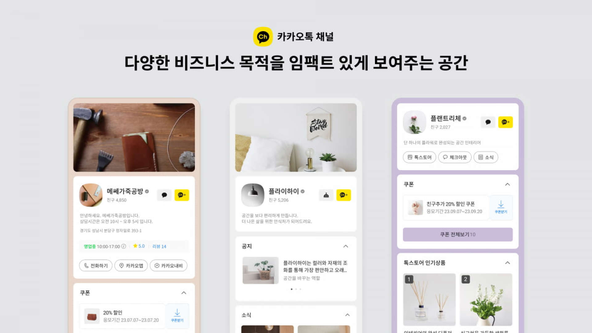 카카오는 카카오톡 채널의 홈 화면인 ‘채널홈’을 개편했다고 21일 발표했다. 채널홈은 카카오톡 채널의 프로필을 눌렀을 때 나타나는 화면이다. 카카오톡 채널을 이용하는 사업자들이 업종