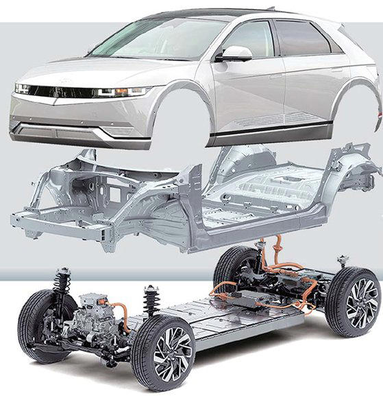 ━ 치열해진 전기차 플랫폼 전쟁 현대차그룹이 2020년 선보인 전기차 전용 플랫폼 E-GMP(Electric-Global Modular Platform). 현대제철이 생산한 가볍고 단단한 초고강도 강판이 60% 이상 쓰인다. 정의선 회장