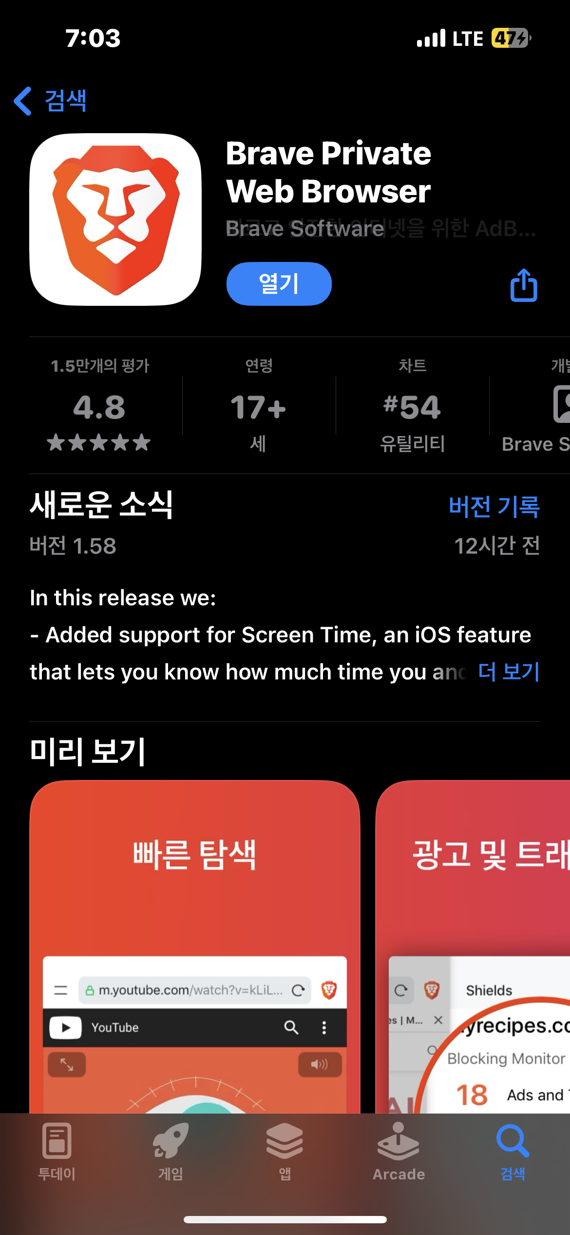 브레이브(Brave) 앱을 다운로드 받아서 설치해 보자.