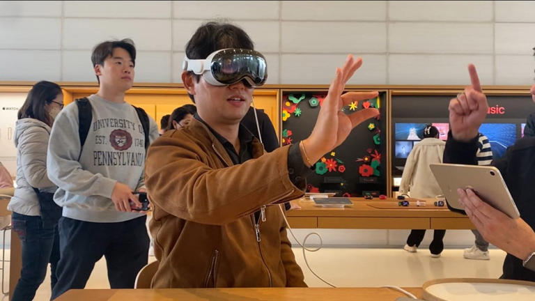 “이제껏 해보지 못한 새로운 경험을 하게 될 겁니다.” 3일(현지시간) 미국 캘리포니아주 쿠퍼티노 애플 본사의 애플스토어. 전날 출시된 확장현실(XR) 헤드셋 ‘비전프로’ 체험해보기 위해 자