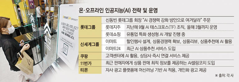 “AI 적극 활용” 신동빈 주문에…롯데 속도전 대형마트·편의점서 AI 운영하는 신세계 이커머스도 잇달아 AI 적용, 판매자 매출 제고 인공지능(AI)이 유통업계의 올해 최대 화두로 부상했다. 온라