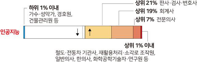 인공지능(AI)에 의해 대체될 가능성(AI 노출지수)이 높은 직업과 낮은 직업의 분포. 의사, 회계사, 변호사 등 전문직은 다른 직업들에 비해 AI 노출지수가 상대적으로 높은 것으로 나타났다. 그래픽=박구원 기자