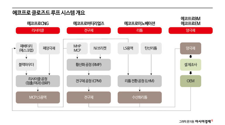 에코프로의 모태가 됐던 대기 환경 사업은 계열 분리를 통해 현재 에코프로HN에서 진행하고 있다. 이차전지 분야에서는 2016년 물적 분할을 통해 에코프로BM(양극재 )을 설립한 것을 시작으로 현재 에코프로 EM(삼성SDI용 양극재), 에코프로머티리얼즈(전구체), 에코프로이노베이션(수산화 리튬 가공), 에코프로CNG(리사이클), 에코프로AP(산소 및 질소 생산) 6개사가 진행한다.