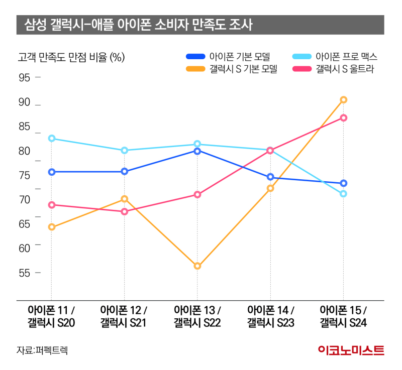 실제로 소비자의 긍정적 반응이 이어지고 있다. 지난 1월 25일까지 일주일간 진행된 국내 갤럭시 S24 시리즈의 사전 판매 기록은 121만대로 나타났다. 그간 출시된 어떤 모델보다 높은 성적이다. 소비자 리뷰 데이터 분석업체 퍼펙트렉 조사에서도 10명 중 9명이 최고점(기본 91%, 플러스 84%, 울트라 88%)을 부여했다. 이 조사에서 갤럭시가 아이폰을 넘어선 건 이번이 처음이다. 아이폰 15 시리즈의 고객 만족도 만점 비율은 74~77% 수준을 기록했다.