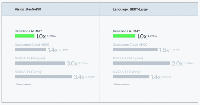 아톰은 128TOPS(1초 당 128조번의 정수 연산) 및 32TFLOPS(1초 당 32조번의 부동소수점 연산)의 성능을 갖췄다. 지난해 시행한 반도체 벤치마크인 'MLPerf 3.0'에서는 엔비디아의 추론용 AI 반도체 대비 1.4~2배 빠른(언어모델 BERT-Large 기준) 속도를 입증하기도 했다.