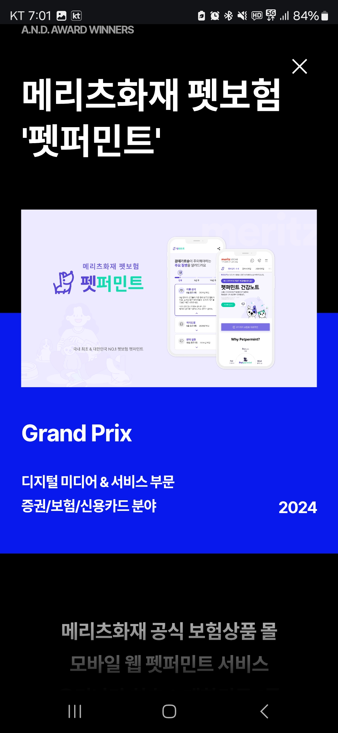 작년 말에 소속사 미래전략실 권유로 도전하게 된 2024년 앤 어워드 수상작 출품 응모 결과, <메리츠화재 '페퍼민트' 서비스>로 앤 어워드 디지털 미디어 & 서비스 부문 증권/보험/신용카드 분야 GrandPrix을 수상하게 되어 메리츠화재 운영PM으로서 더할 나위 없이 기쁘다.