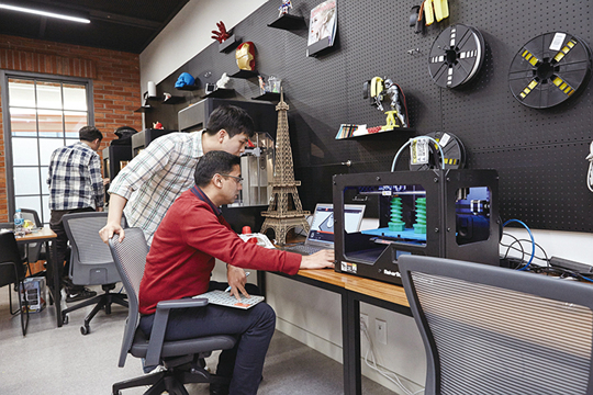 | (사진) 수원 삼성디지털시티 내 마련된 삼성전자의 사내벤처 'C-랩' 프로그램 전용 공간에서 사내벤처 소속 임직원들이 아이디어 구현을 위한 테스트 제품을 만들어 보고 있다. /삼성전자 제공 | |