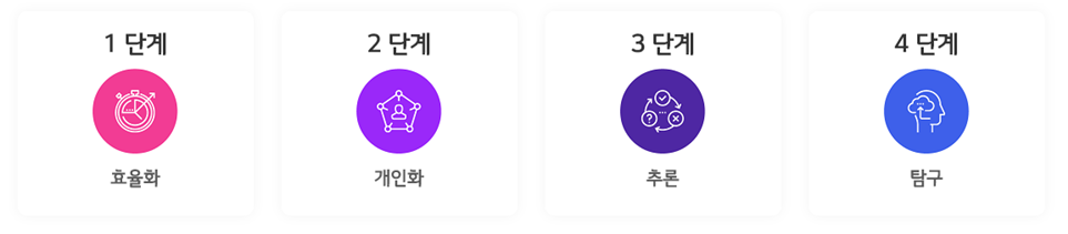 LG전자가 소개한 인공지능 발전 단계는 1단계 효율화(Efficiency), 2단계 개인화(Personalization), 3단계 추론(Reasoning), 4단계 탐구(Exploration) 총 4단계입니다. 각 단계에 대해서 하나씩 알아보겠습니다.