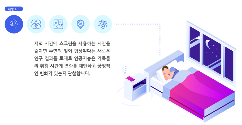 예를 들어, 취침할 때 주변 온도가 17℃ 정도면 편안하게 잠을 잔다는 새로운 정보를 입수한 인공지능은 사용자에게 “천장 냉각팬을 돌리면 시원한 공기를 순환시킬 수 있고 수면에 적합한 체온을 유지하는 데 도움이 됩니다. 주무실 때 냉각팬을 돌리는 게 어떨까요?”라고 먼저 제안할 수 있습니다. 4단계 인공지능을 기반으로 한 스마트 시티에서 우리는 차량과 트래픽 센서 등에서 들어오는 정보를 수집해서 교통시스템을 최적화함으로써 효율적이고 안전한 생활을 경험할 수 있게 됩니다.