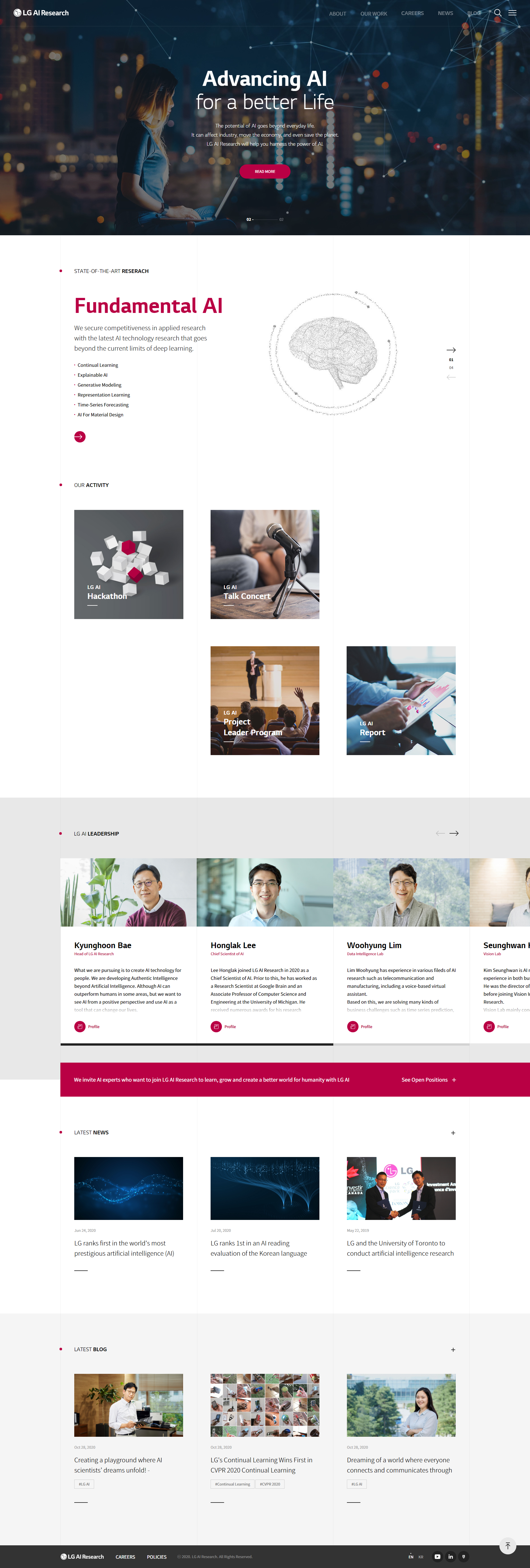LG AI 연구원 홈페이지 기획 /PM (2020.08~2020.11 With the breeze) - FO 서비스/콘텐츠/BO 기획 완료(PC /Mobile /Admin SB, IA, 메뉴구조도) - 디자인 시안보고서 작성 & 시안 컨펌을 리드 - 품질구현 및 검증기준 합의(OS, 브라우저, 단말기) - 단위/통합테스트 계획 및 시나리오 작성 - HS Ad & 고객사 커뮤니케이션 리드 - 디자인/퍼블리싱/개발 및 WBS 일정관리(Inhouse) - 11월 2일 1차 오픈 및 안정화 완료. 11월 13일 현장 철수 |