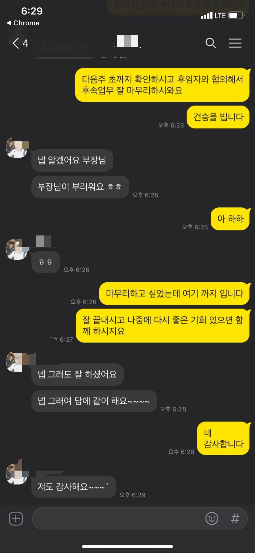 동료 들도 협업 툴 잔디와 구두로 작별 인사를 나누었다.