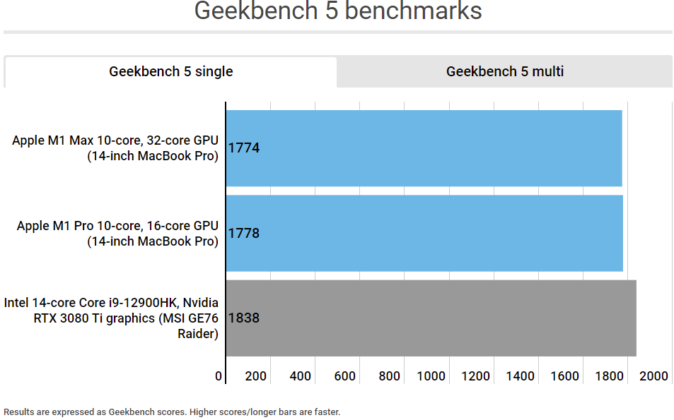 명확히 해두자면, PCWorld는 리뷰에서 애플 실리콘을 비교군에 넣지 않았다. 윈도우 노트북을 리뷰하면서 앨더레이크를 전작이나 8코어 라이젠 9 5900HX CPU와 비교하는 리뷰를 작성했다. PCWorld가 사용하는 벤치마크 상당수는 맥을 지원하지 않거나 네이티브 M1 버전이 없는 경우가 많다. 그러나 긱벤치와 시네벤치 두 가지는 맥을 지원하고, Macworld에서도 사용하는 벤치마크다. 여기에서 많은 것을 알 수 있었다.