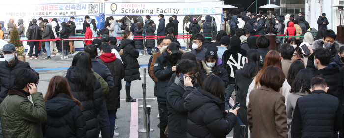 지난 26일 서울 강남구보건소 선별진료소에 시민들이 코로나19 검사를 받기 위해 긴 줄을 서 있다. [사진 = 한주형 기자]