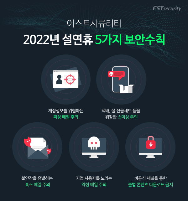 국내 보안 기업 이스트시큐리티는 방역패스 시행, 오미크론 확산세로 이번 설 연휴에는 온라인 장보기 및 백신 접종이 증가할 것으로 예상했다. 이에 따라 '백신 예약', '국민 비서', '카카오 결제' 등의 키워드를 이용해 피싱 메일 기반 계정 정보 유출 시도가 증가할 것으로 예상했다.