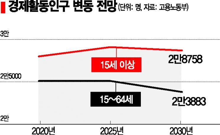 우리나라의 15세 이상 경제활동인구가 2025년을 정점으로 감소할 것이란 경고가 나왔다. 비경제활동인구를 포함한 생산가능인구도 2030년까지 증가폭이 절반 이하로 급감하고 고용규모가 큰 제조