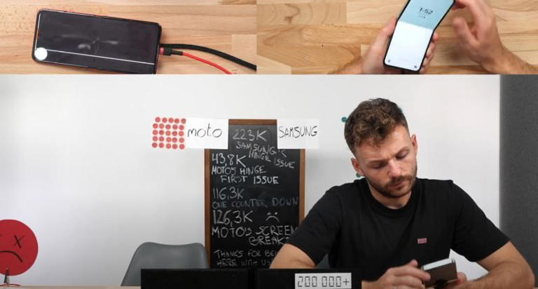 "저분은 언제 퇴근하나요?" 삼성전자의 최신예 폴더블폰 갤럭시Z플립5의 '내구성' 실험을 하던 유튜버가 나흘째 테스트를 이어가고 있어 관심이 쏠린다. 플립5의 비교용 표본으로 삼은 모토롤라