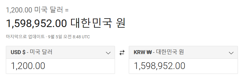 약 1,199달러인데.. 1,200달러라고 해 보면 한국돈으로 현재 환율 기준 1,598,952원이네요.