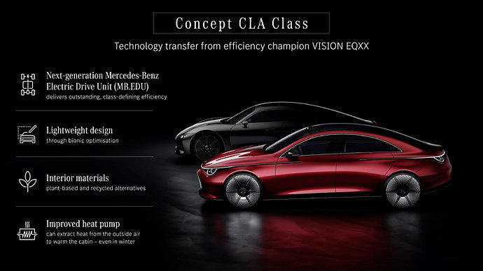 메르세데스-벤츠는 IAA 모빌리티에서 컨셉 CLA 클래스를 선보이며 메르세데스-벤츠 모듈러 아키텍처(MMA)를 기반으로 한 순수 전기 CLA를 출시할 계획을 밝혔다. 컨셉 CLA 클래스는 아직은 컨셉카지