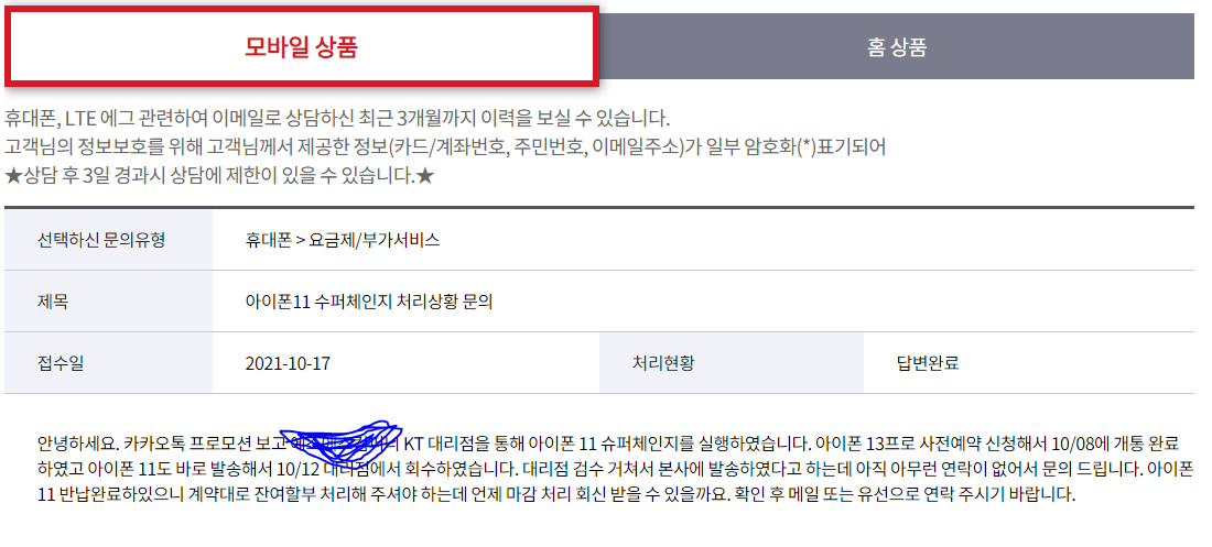 그리고 대리점에서는 10/12 아이폰 11을 회수하고, 자체 검수 후 KT 본사 그린폰 센터로 보냈다고 합니다. 대리점에 문의하니 본사로 보냈고 회신을 기다리고 있다고 하고, 답답해서 KT 고객센터에 문의하니 다음과 같은 답변이 왔네요.