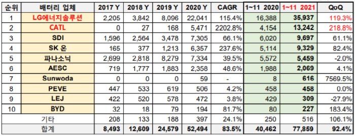 24일 업계에 따르면 시장조사업체 SNE리서치가 23일 '2021년 1~11월 업체별 유럽 전기차 배터리 사용량'을 발표했다. 조사는 해당 기간 내 유럽에 등록된 전기차·플러그인하이브리드차(PHEV)·하이브리드차(HEV)에 장착된 배터리의 에너지양을 토대로 이뤄졌다.