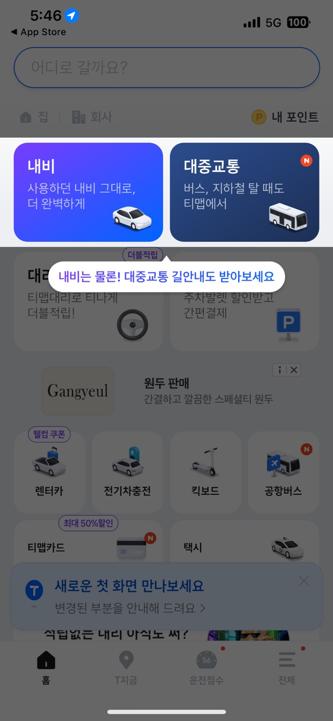 올뉴 티맵. 바로 업뎃해서 깔아봤어.... 화면 구성이랄까 기능이 카카오 T와 비슷해 졌더군.